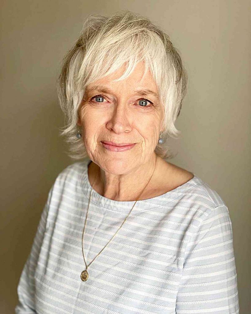 Here’s a shagged pixie cut for thick hair. If you had a shag hairstyle in the 60s, now is your chance to revisit the style in your current 60s. Shags suit all face shapes, and your stylist will guide you to choose the best length according to your face shape.