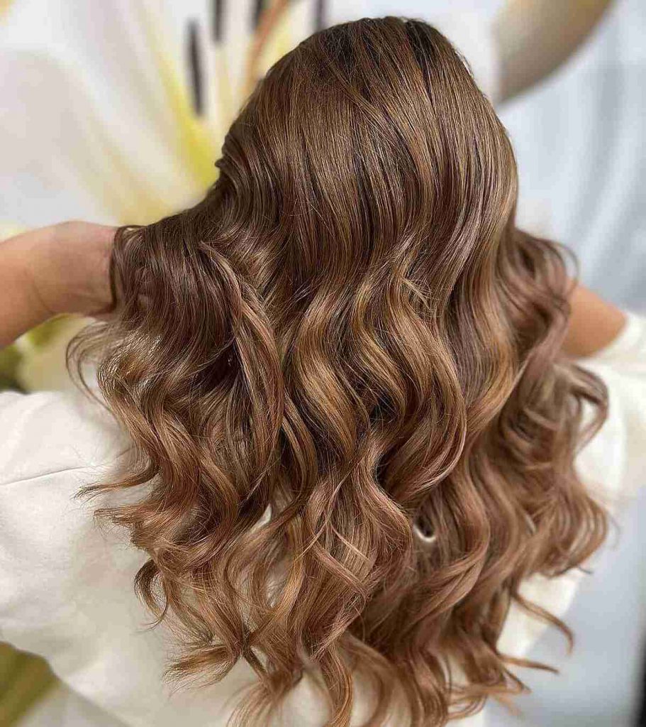 You can’t go wrong with beautiful long dark caramel hair with waves. Chocolate and caramel balayage colors are combined in this hair color idea, creating a luxurious and gorgeous effect.