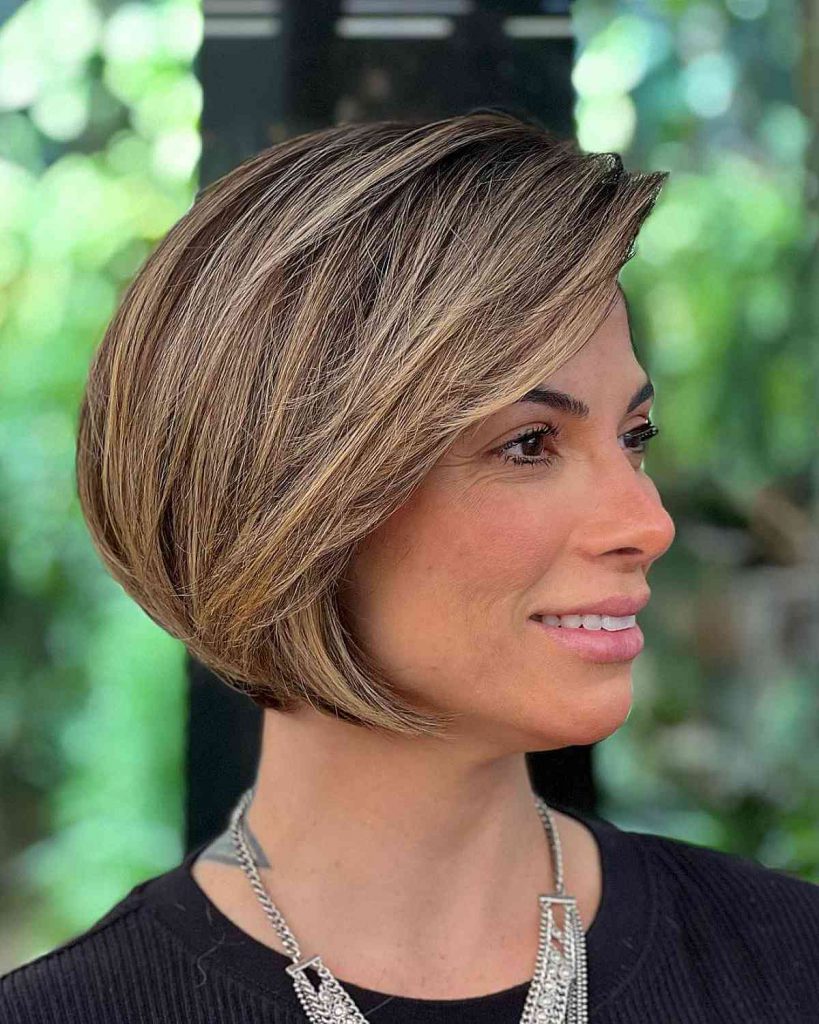 Consider a short, textured bob with short side bangs. It’s for the progressive woman who wants sassy, fun, and stunning hair. This cut is trendy and has a great foundation for a balayage to achieve a beachy look. In the summer, these short bangs and cut are easy to style.