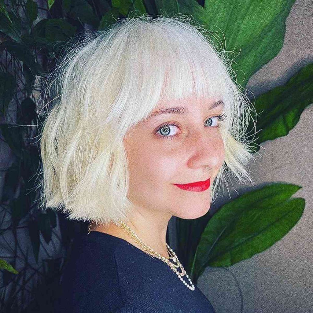 Look effortlessly cool with a lived-in blonde bob with wispy bangs. I’ve found that these cuts are very versatile and you can create the perfect cut for any hair type. Cutting the ends blunt will give your fine hair a fuller-looking silhouette. If you want to create a light wave, you’ll need to be handy with a flat iron. Use an up and down motion down your hair strand to create the perfect “S” wave.